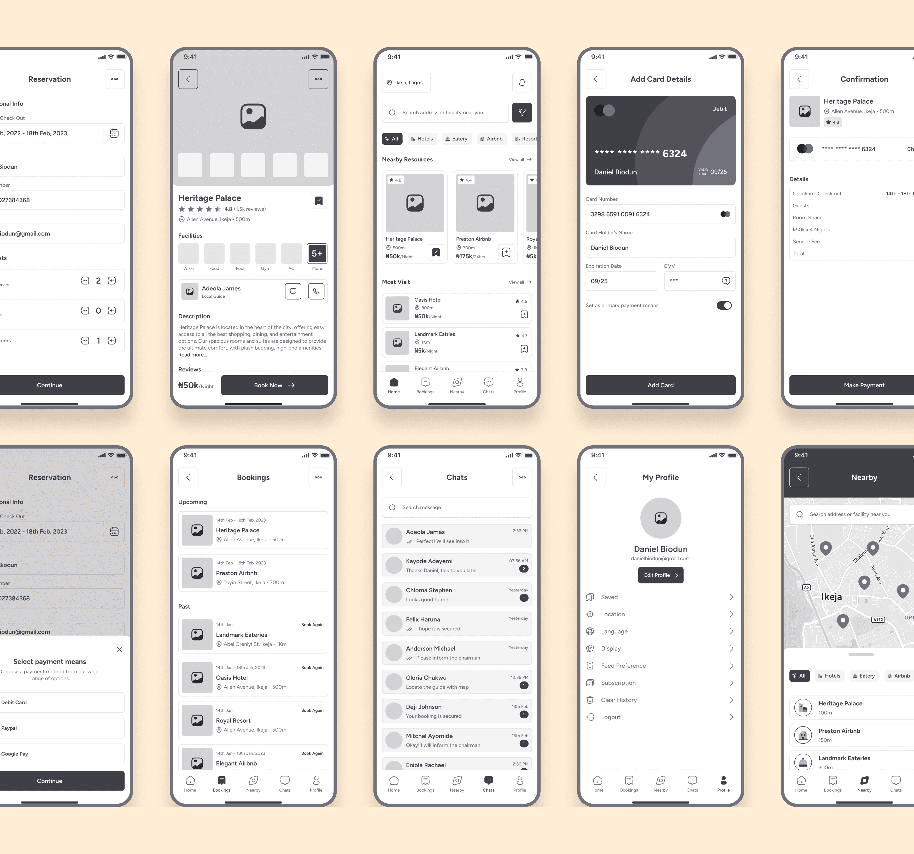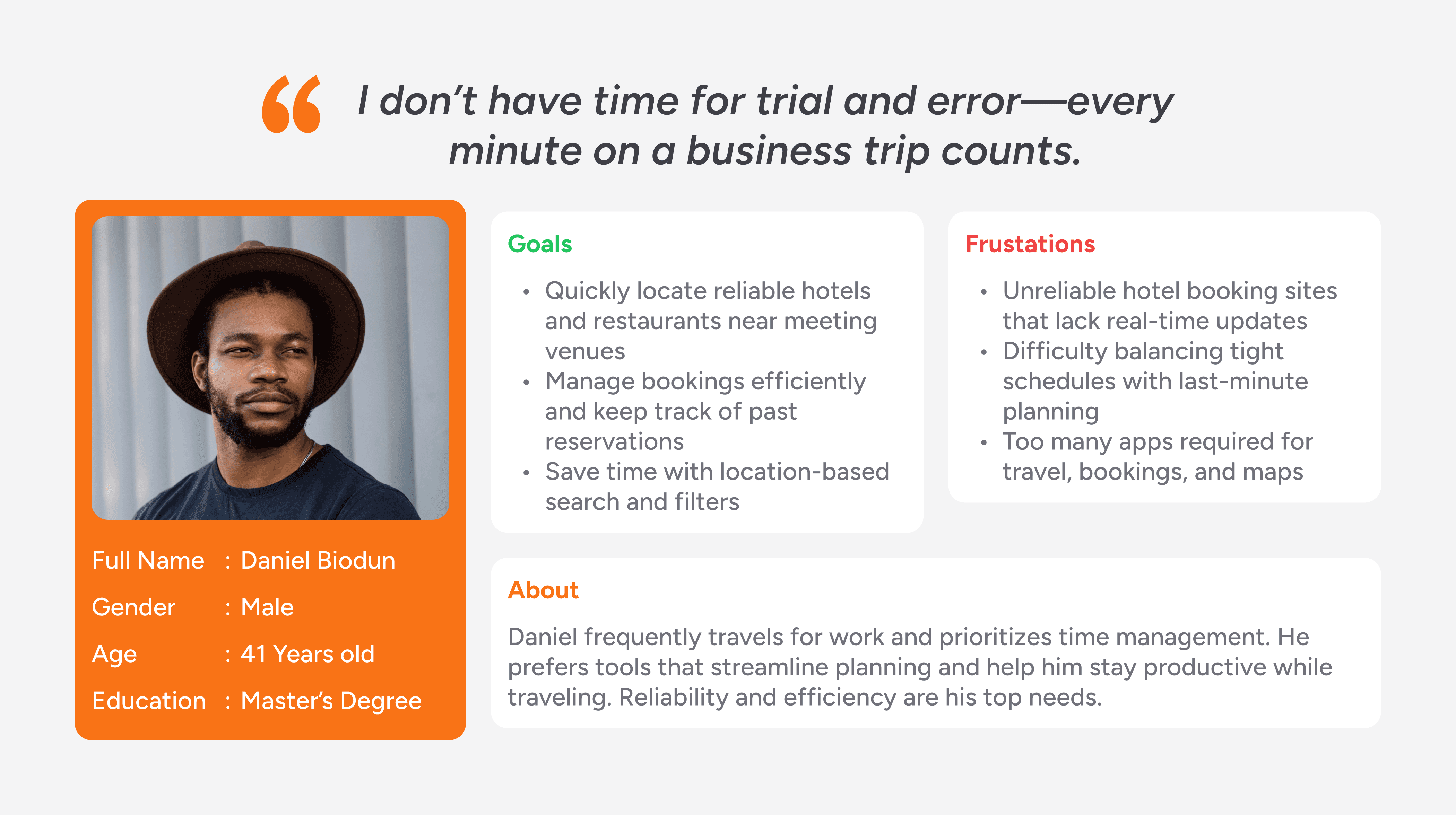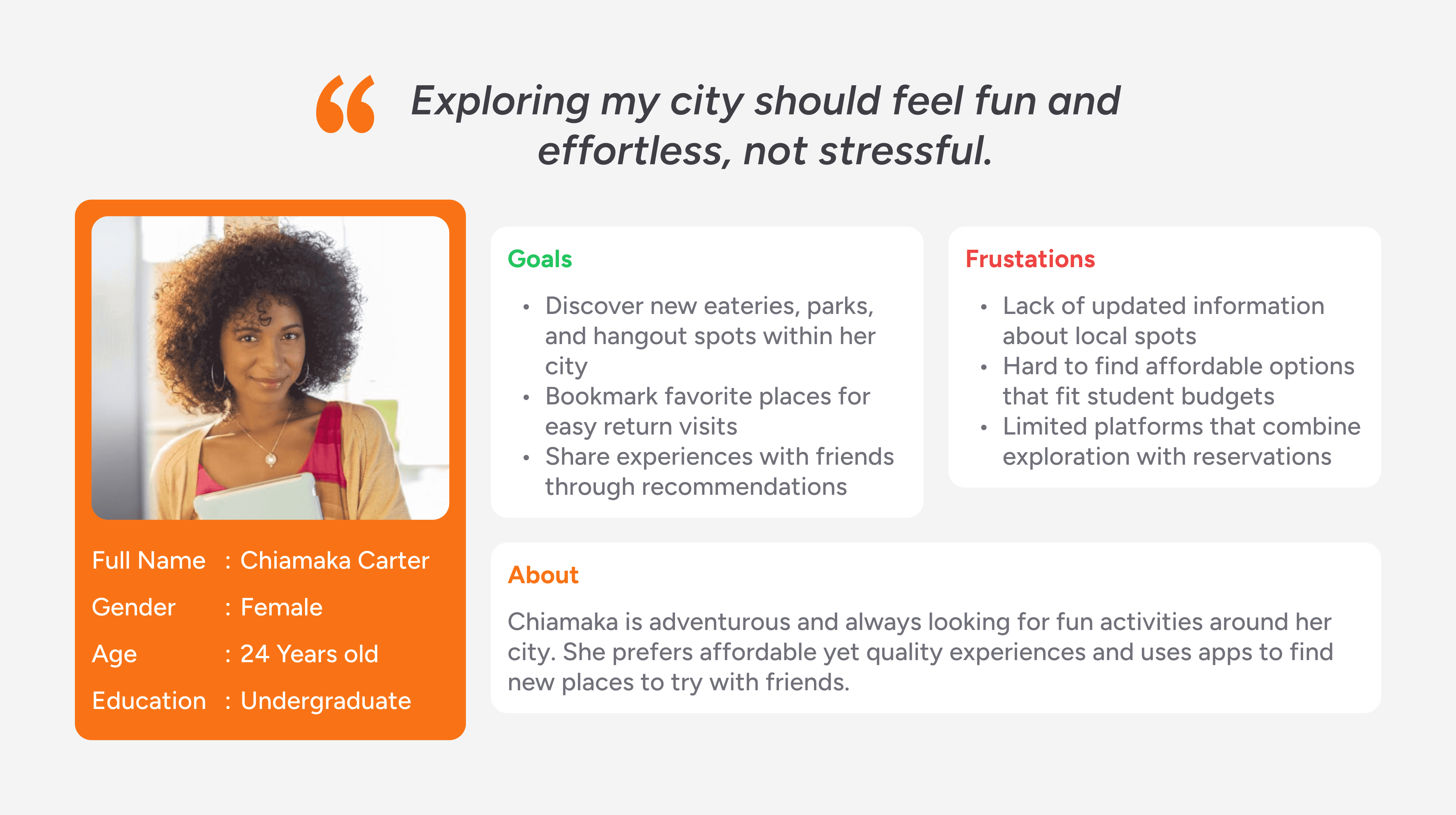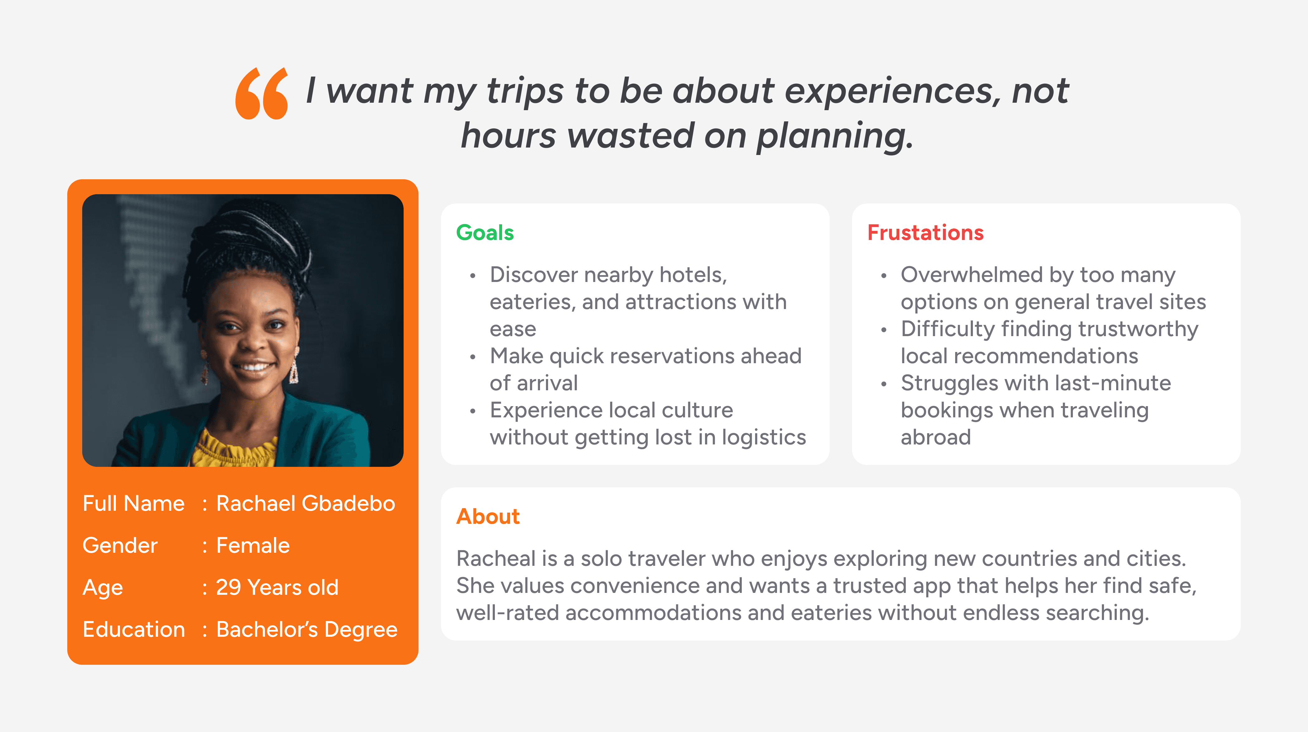 Personas such as “Rachael, the traveler and tourist”, “Daniel, the business visitor” and “Chiamaka, the local explorer” helped keep user needs central throughout the design process.