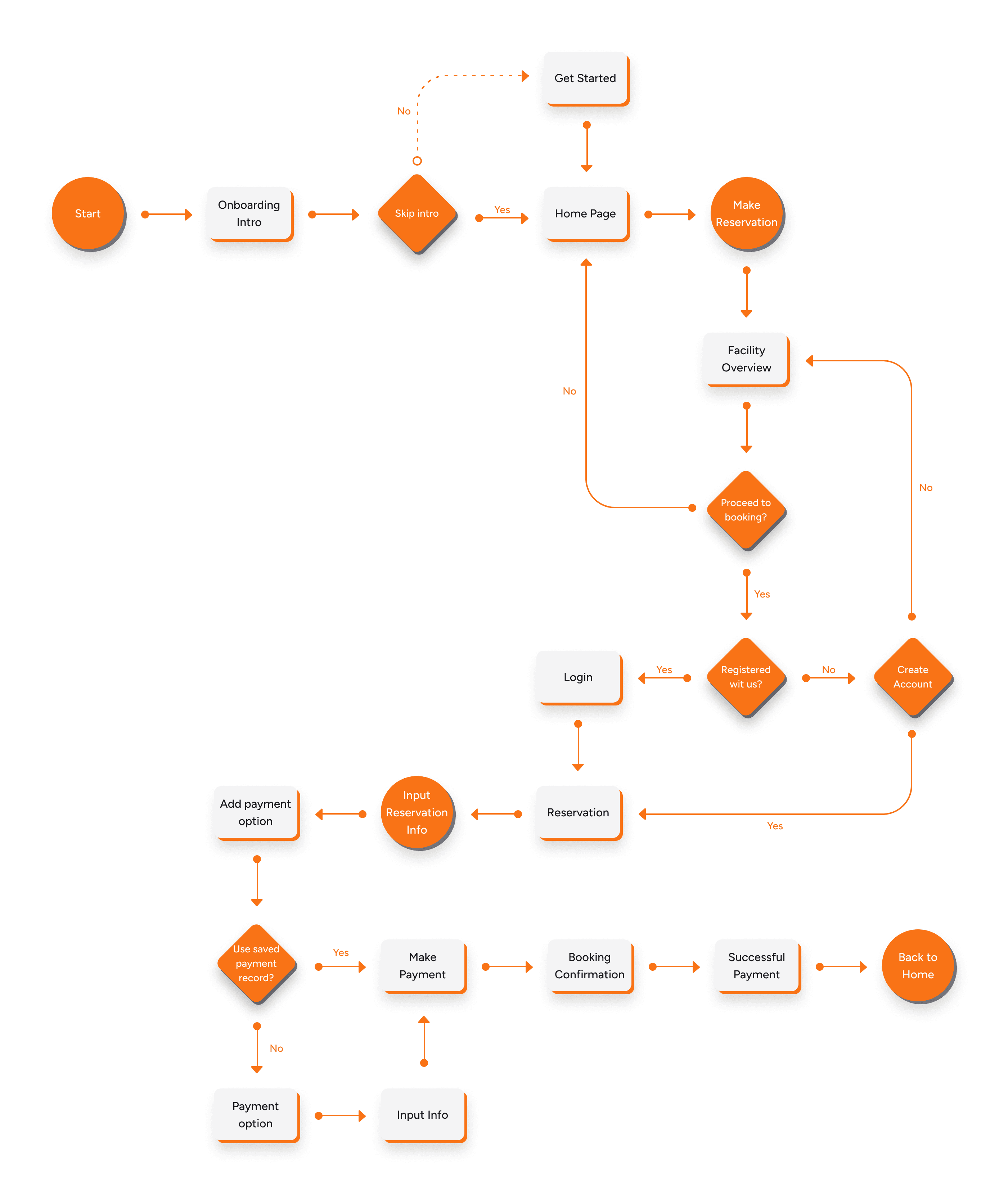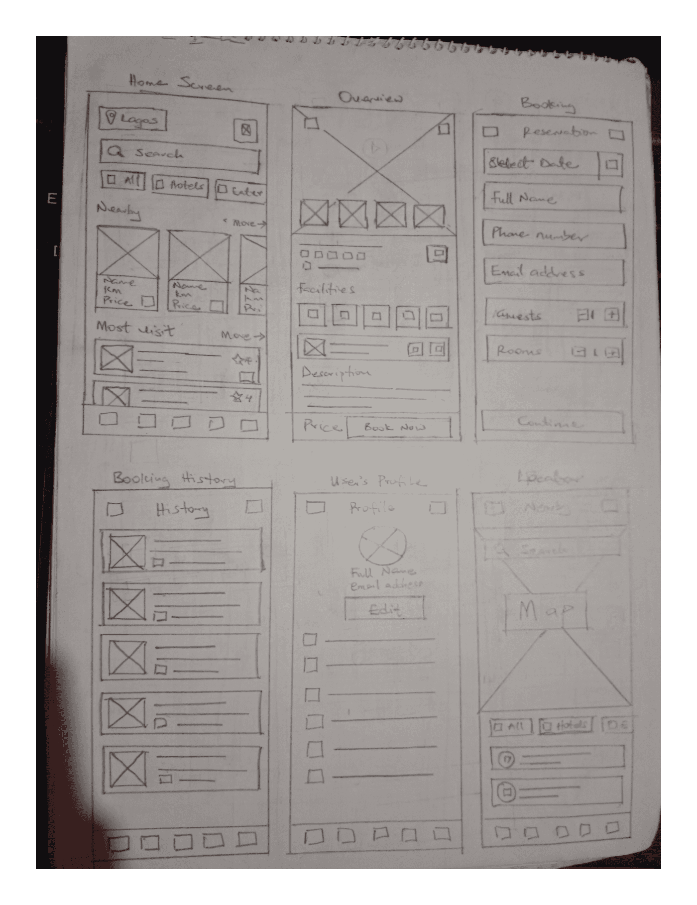 I took time to draft iterations of each screen of the app on paper ensuring that the elements that made it to digital wireframes would be well-suited to address user pain points. For the home screen, I prioritized a quick and easy process to help users save time while browsing through the app to find the best-suited facility for their needs, and also book and make reservations ahead of time.