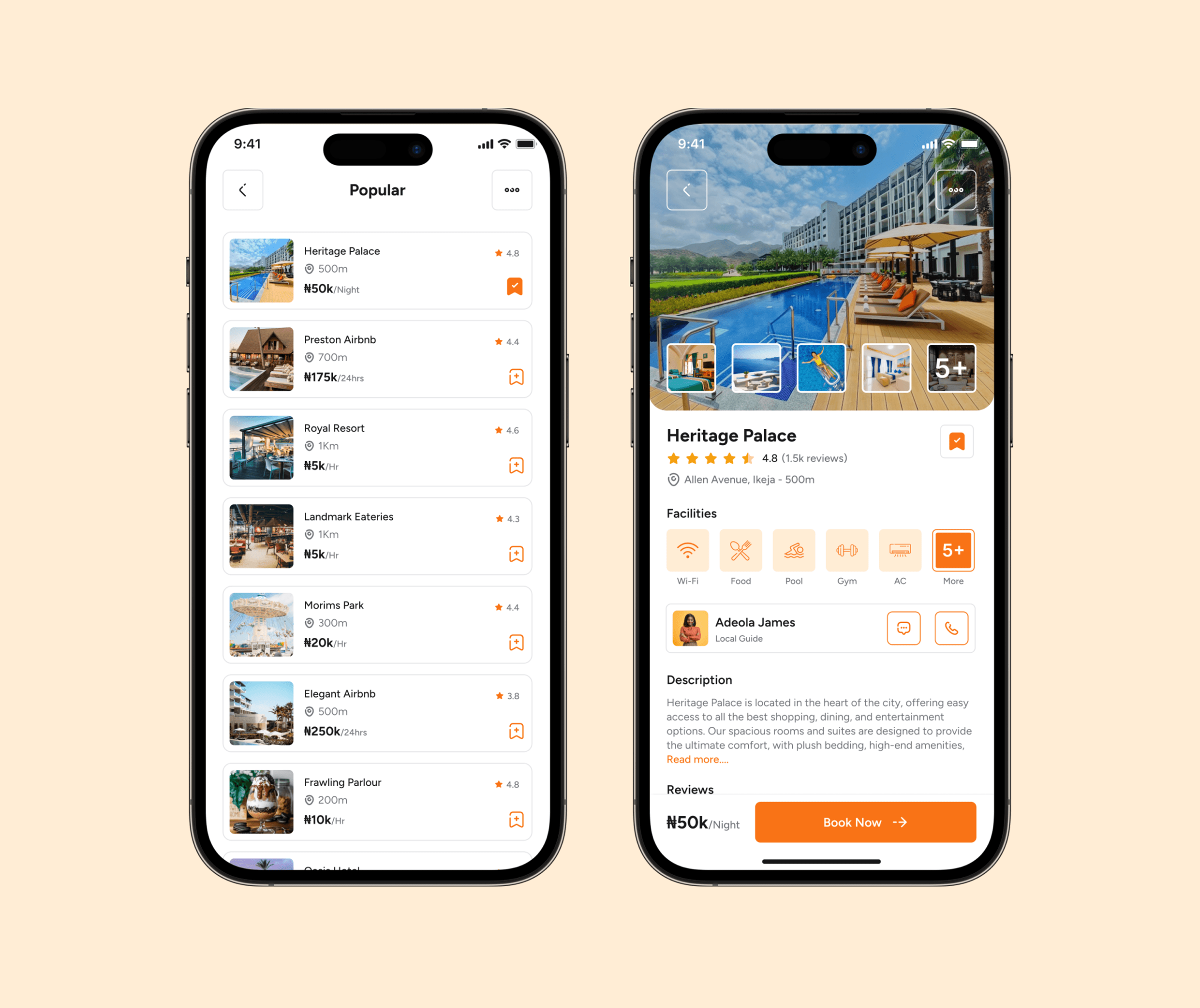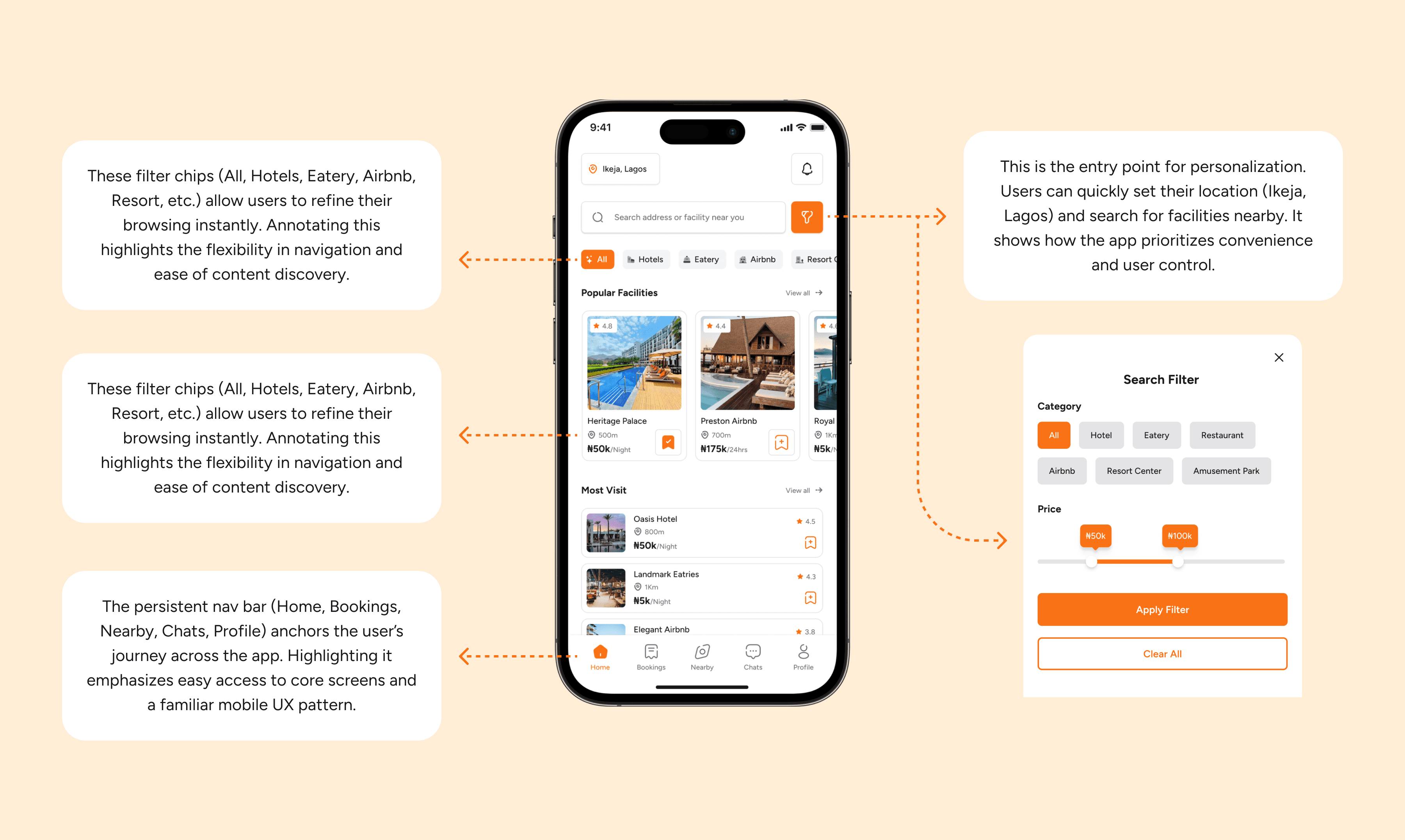 Scenario 1: A tourist arrives in a new city, opens the app, and uses the map view to find nearby hotels → checks reviews → books directly in-app.