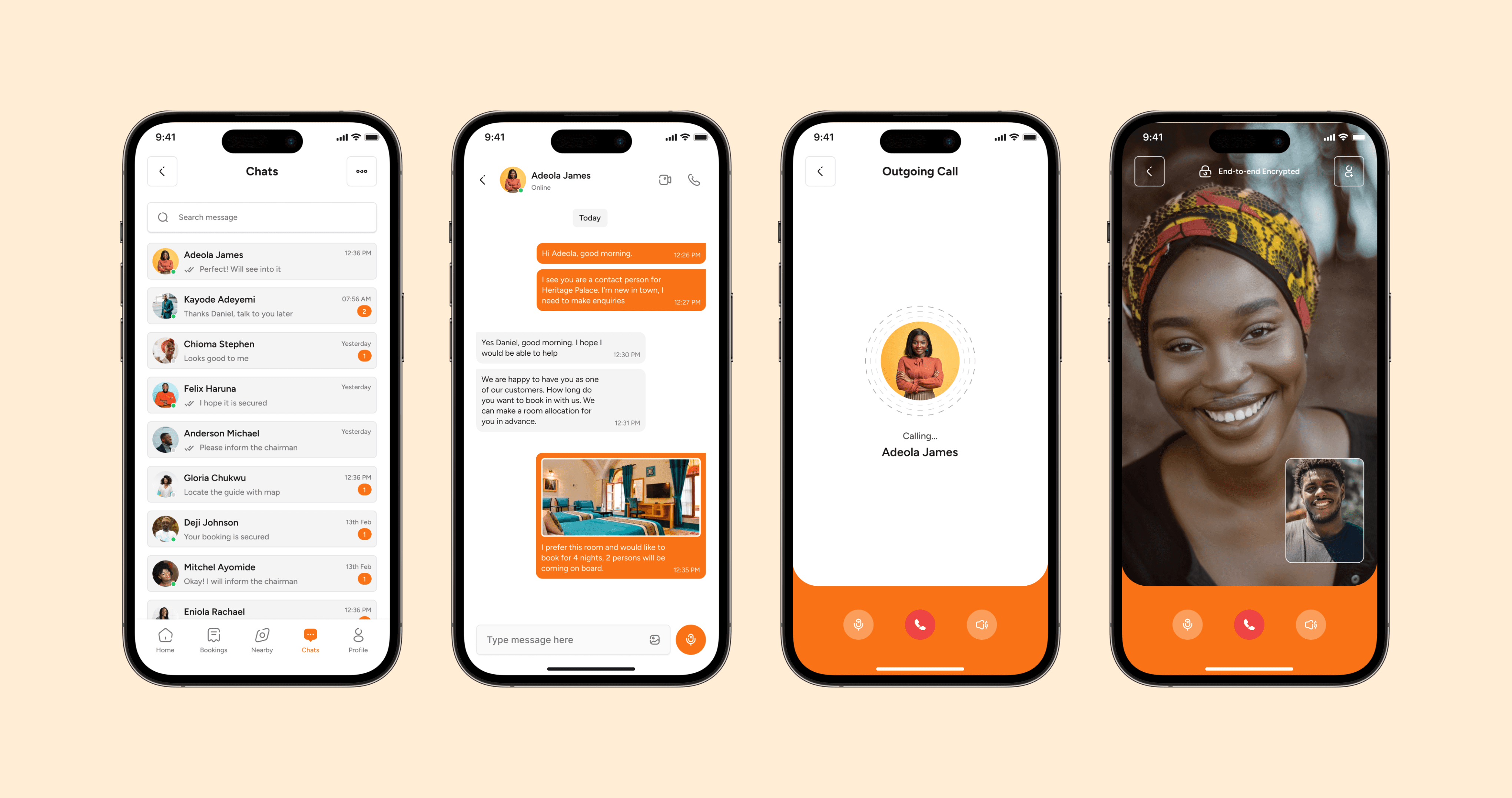 The contact screens offer users multiple ways to connect with facilities—via direct calls for urgent needs or in-app chats for real-time conversations. This flexibility ensures quick responses, personalized assistance, and smoother booking experiences.