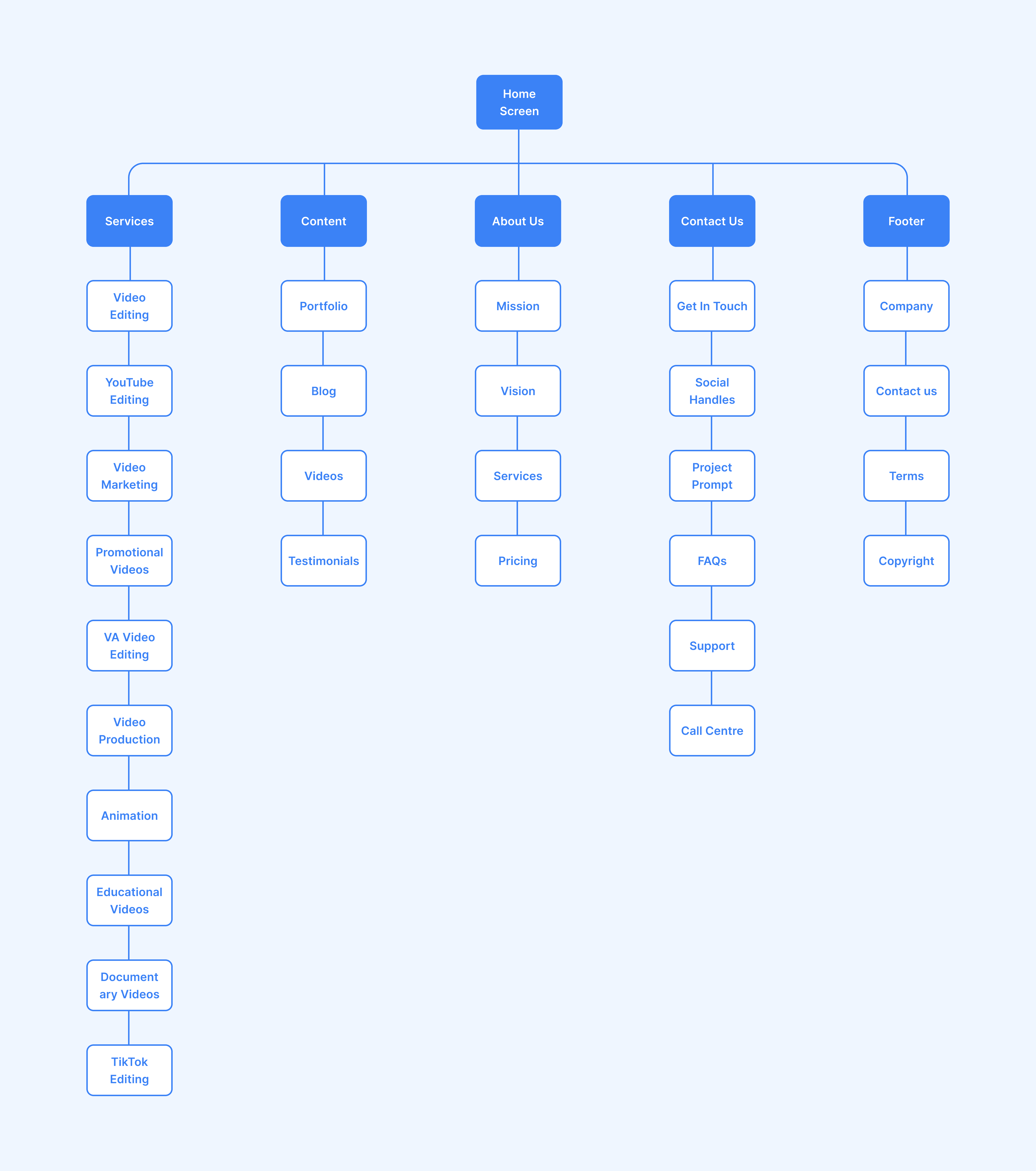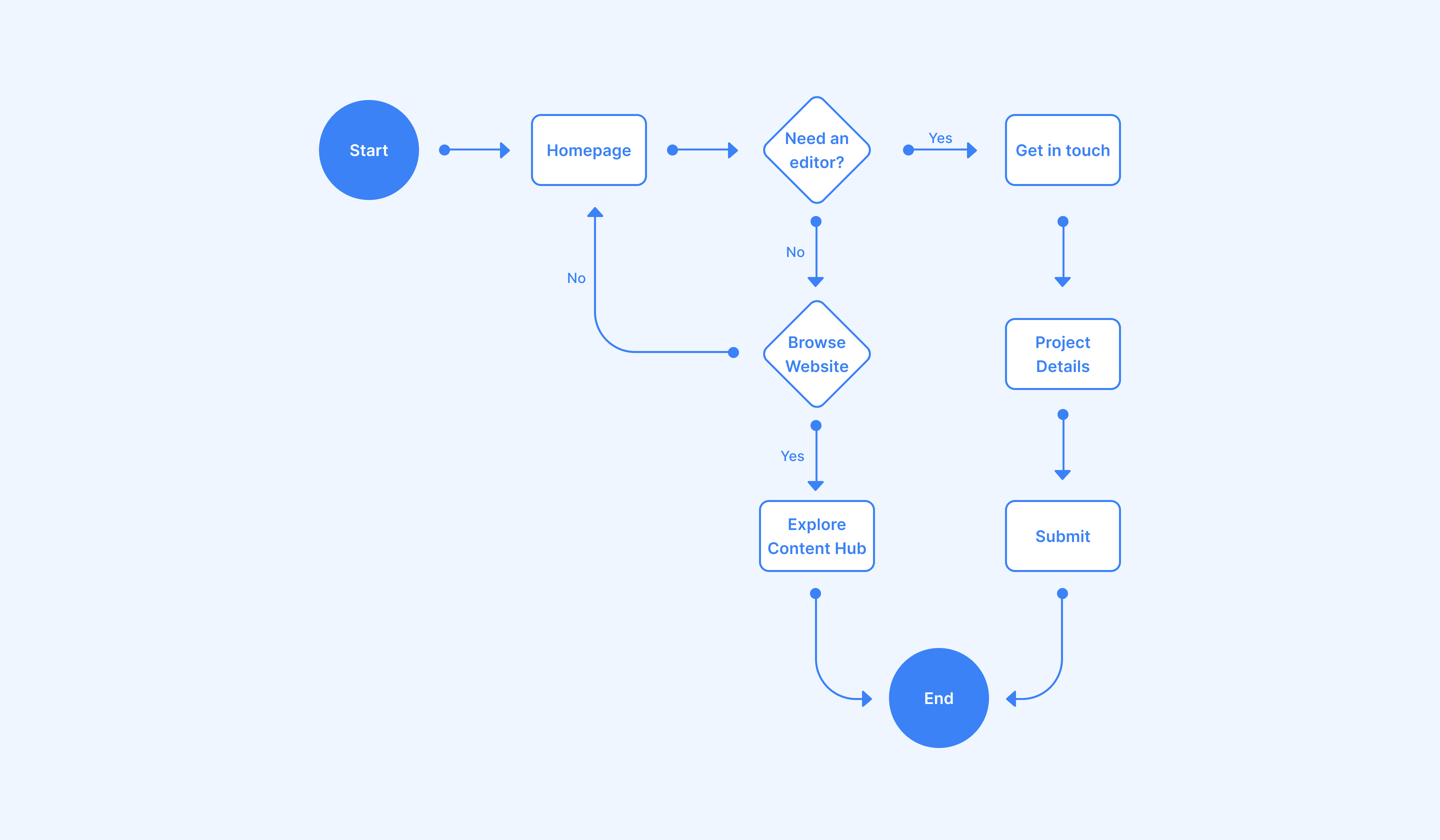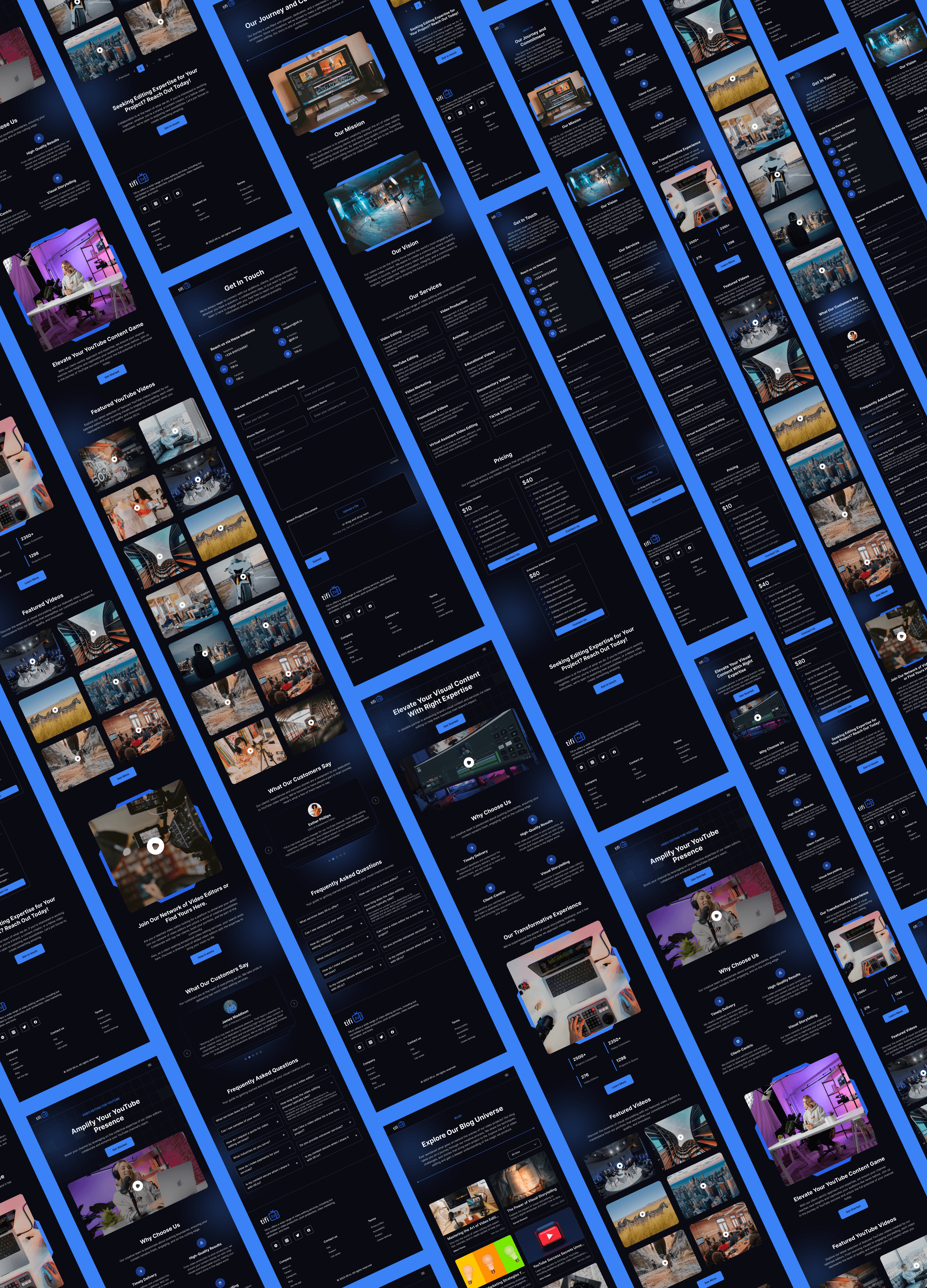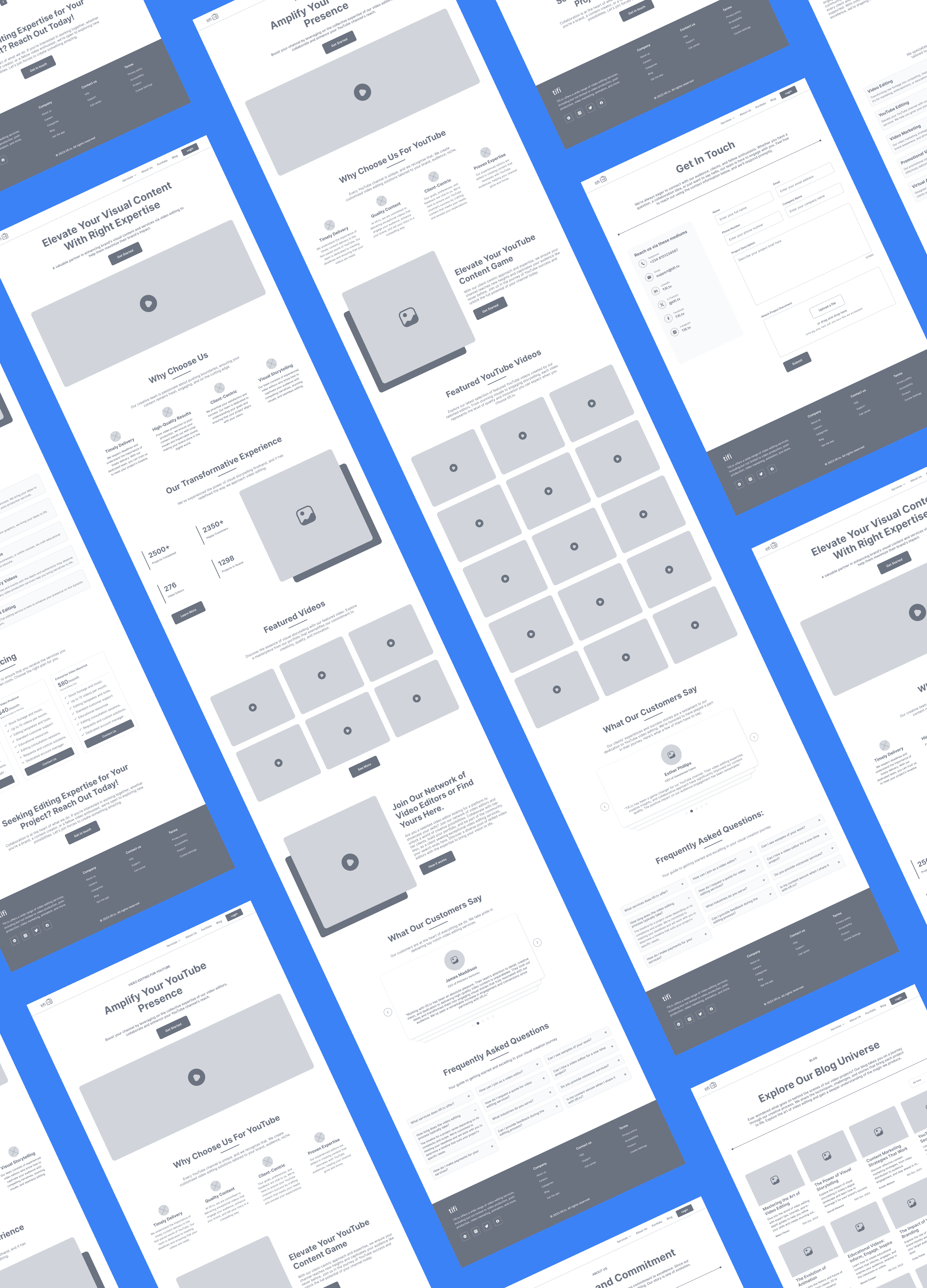 I started with low-fidelity wireframes, mapping out flows for clients to hire editors, editors to showcase their work, and audiences to browse content. The client flow emphasized speed and simplicity: filters, portfolios, and direct hiring. For editors, the focus was on profile building and visibility. For the general audience, the design leaned toward immersive video previews and easily scannable blog posts.
