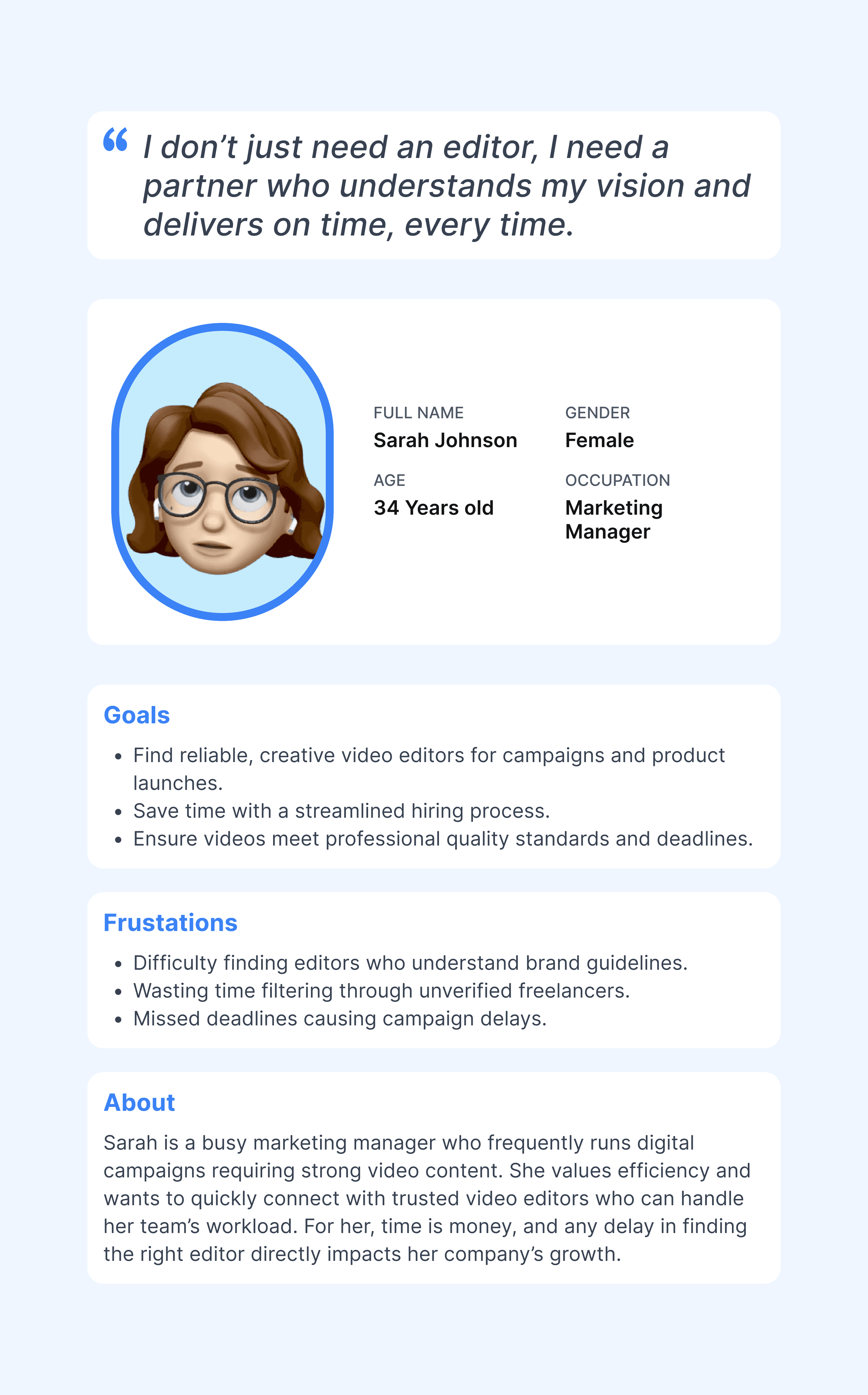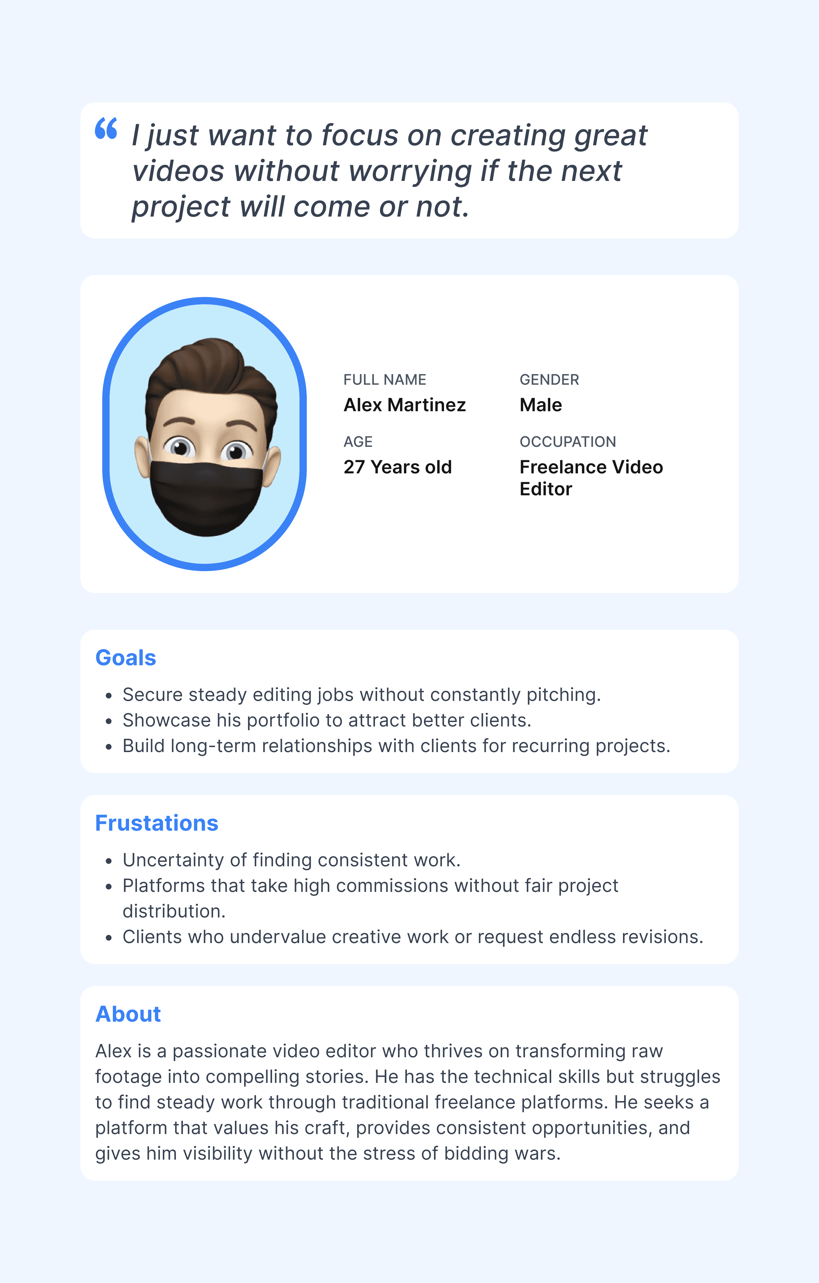 To ground the design in reality, I conducted user research with potential clients, freelance editors, and film students. From this, I built personas that represented the core users. Sarah Marketing, a busy marketing manager, needed a straightforward way to hire trusted editors without wasting time. Alex Enthusiast, a freelance video editor, wanted a platform that could recommend him for jobs and at the same time get curated resources and inspiring content to learn from.
