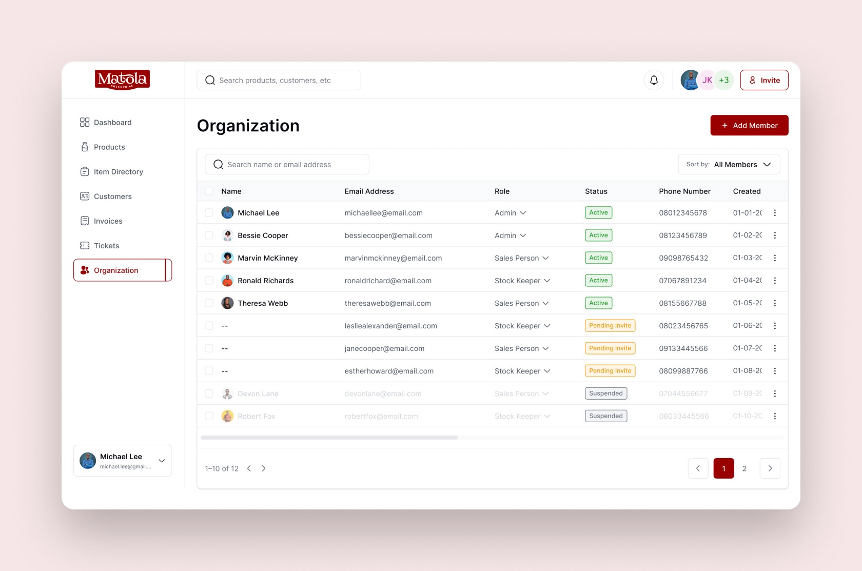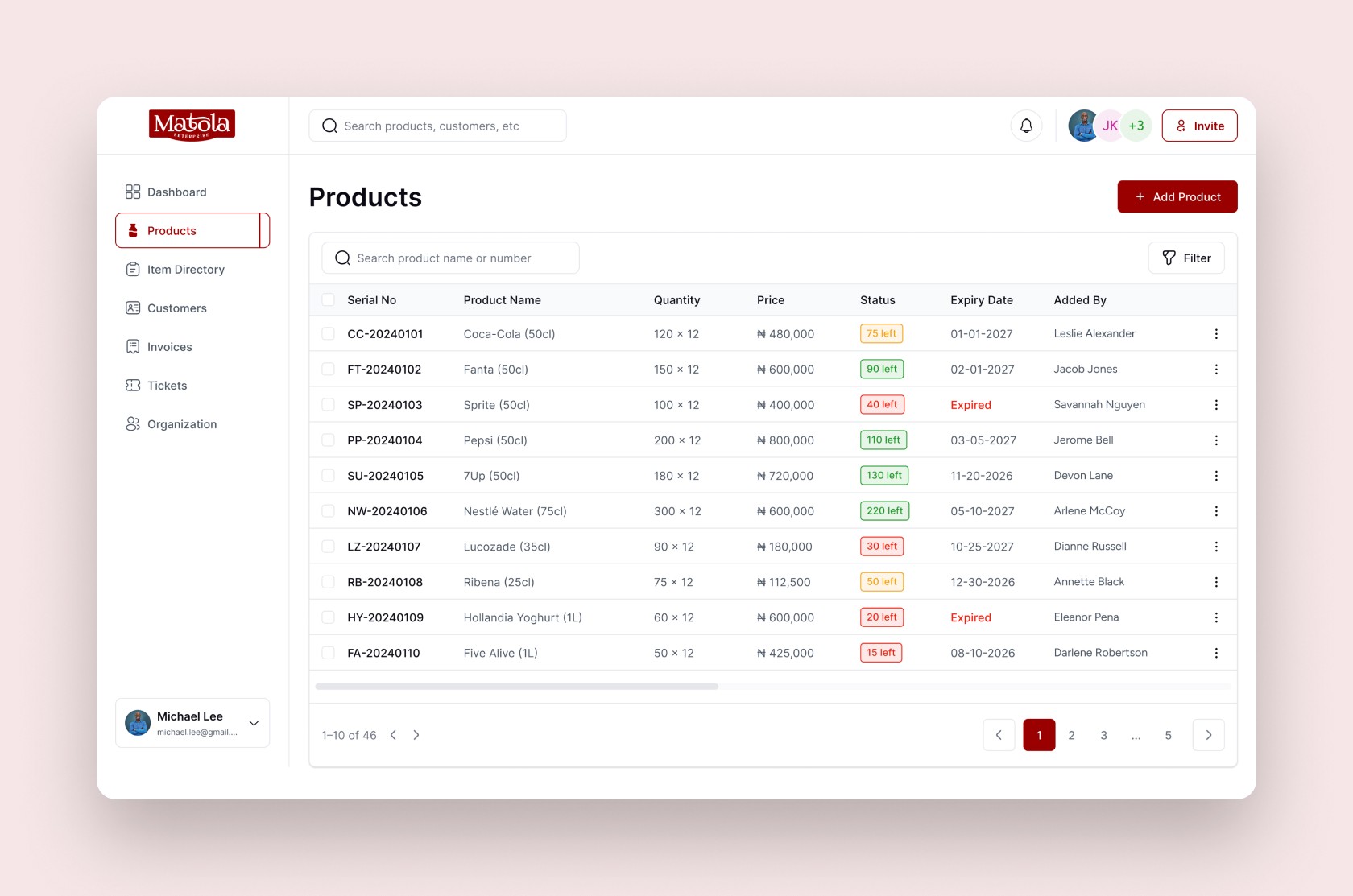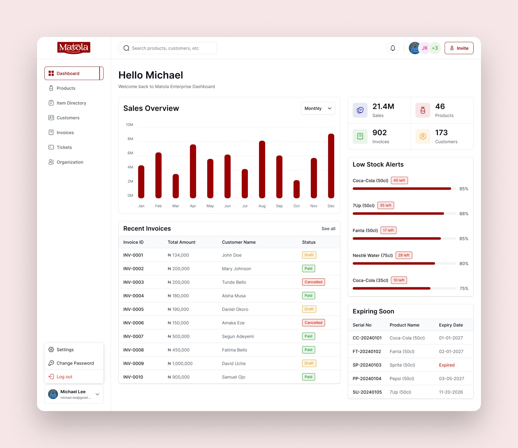 Matola Enterprise needed a unified system that allowed salespeople to record sales seamlessly, admins to track stock in real-time, and the organization to reduce product wastage through expiry notifications.
