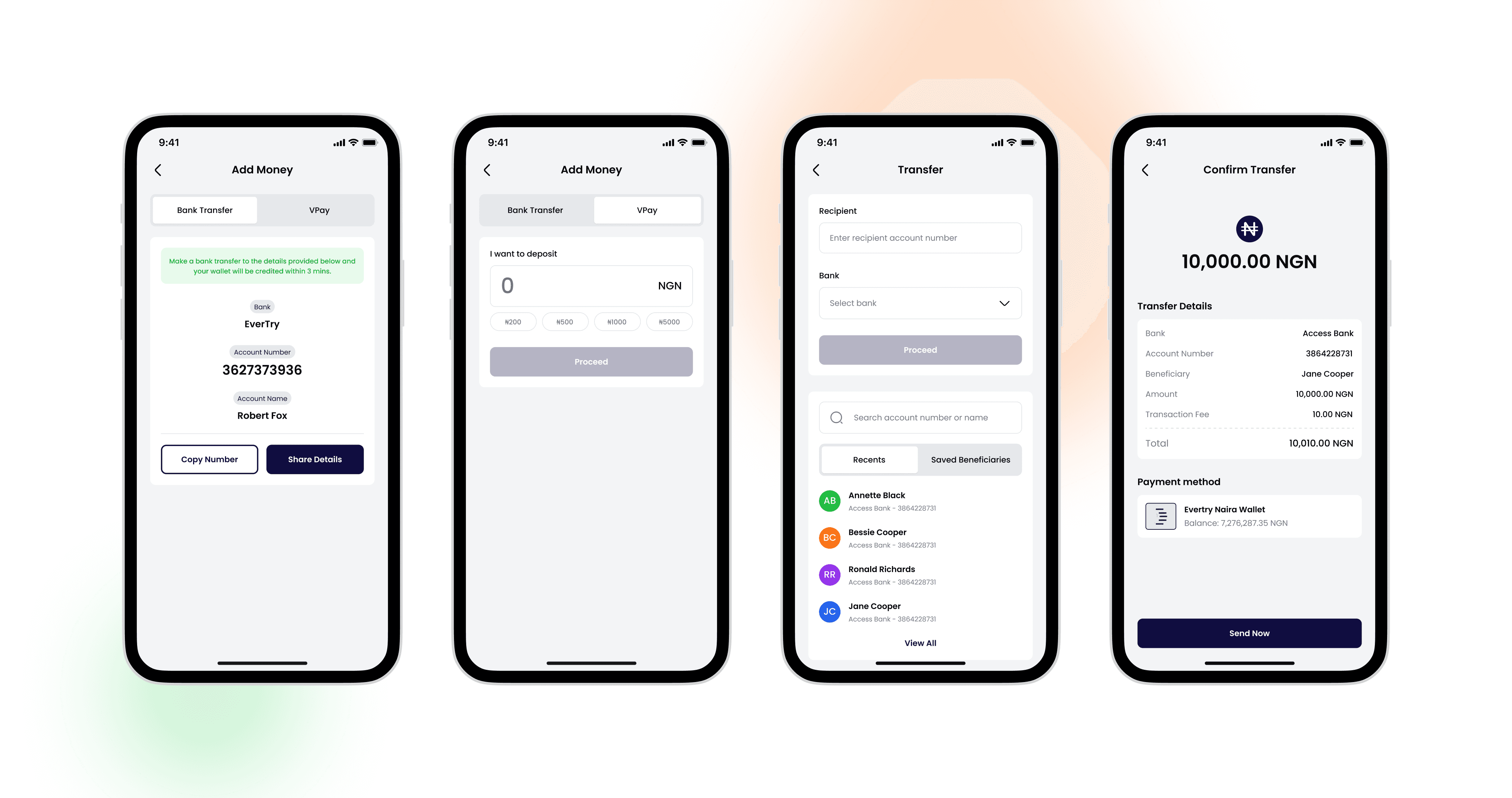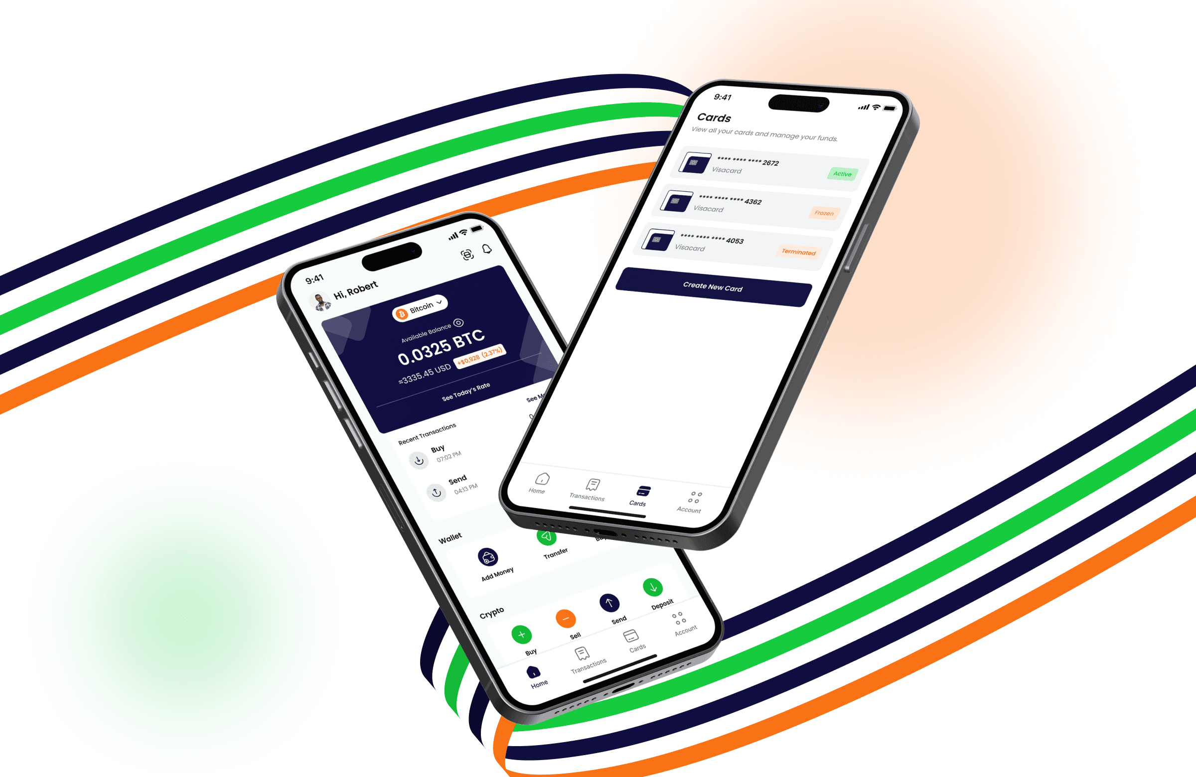 Colours: Chosen to build trust and clarity — deep navy (#100D40) for security and professionalism, green (#14B938) for growth and positive financial outcomes, and orange (#F97316) to draw attention to key actions.