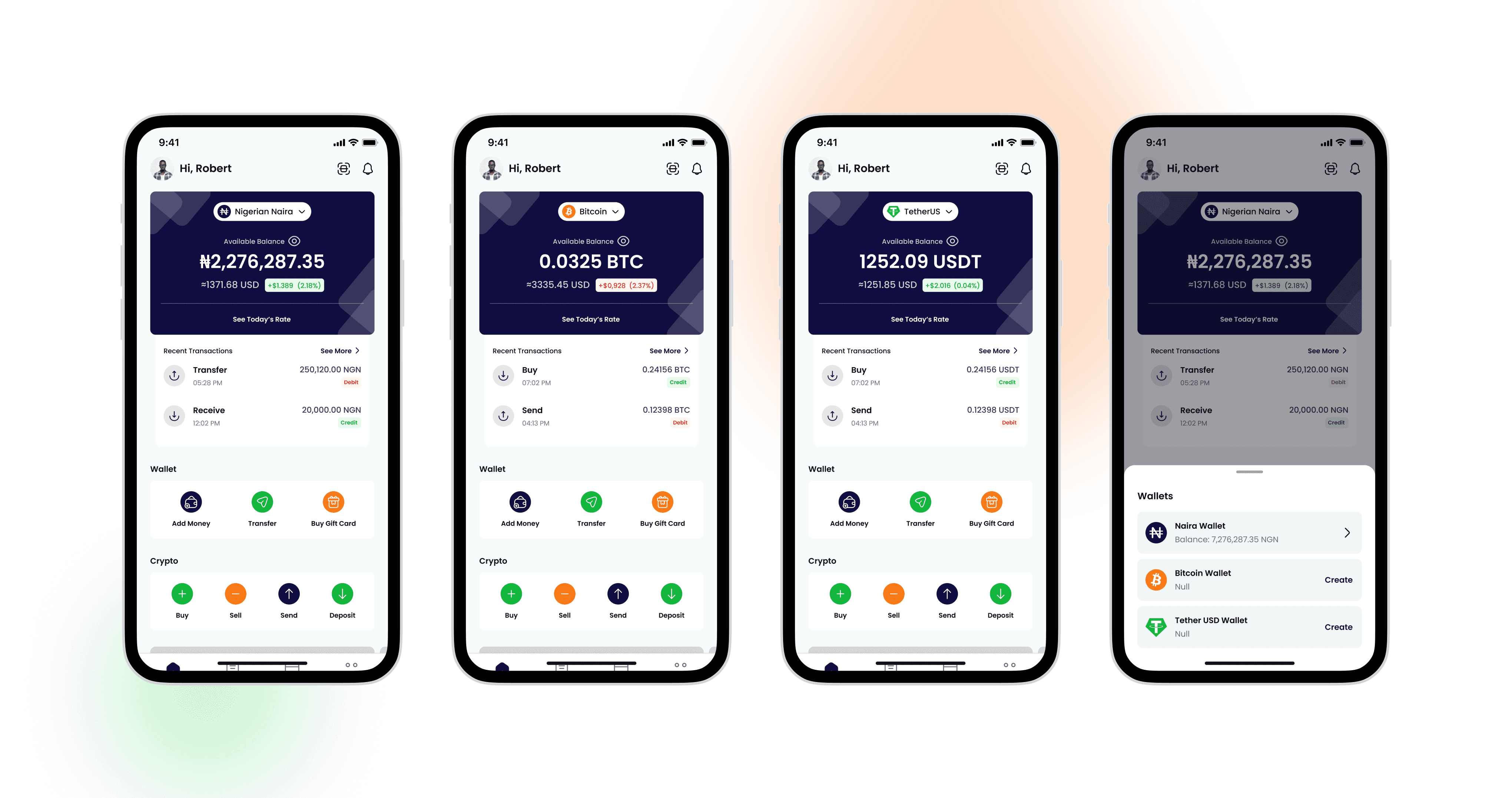 All major wallets (Naira, Crypto, USD) and card info are visible at a glance, with quick-access buttons for actions like “Send,” “Buy,” and “Withdraw.”