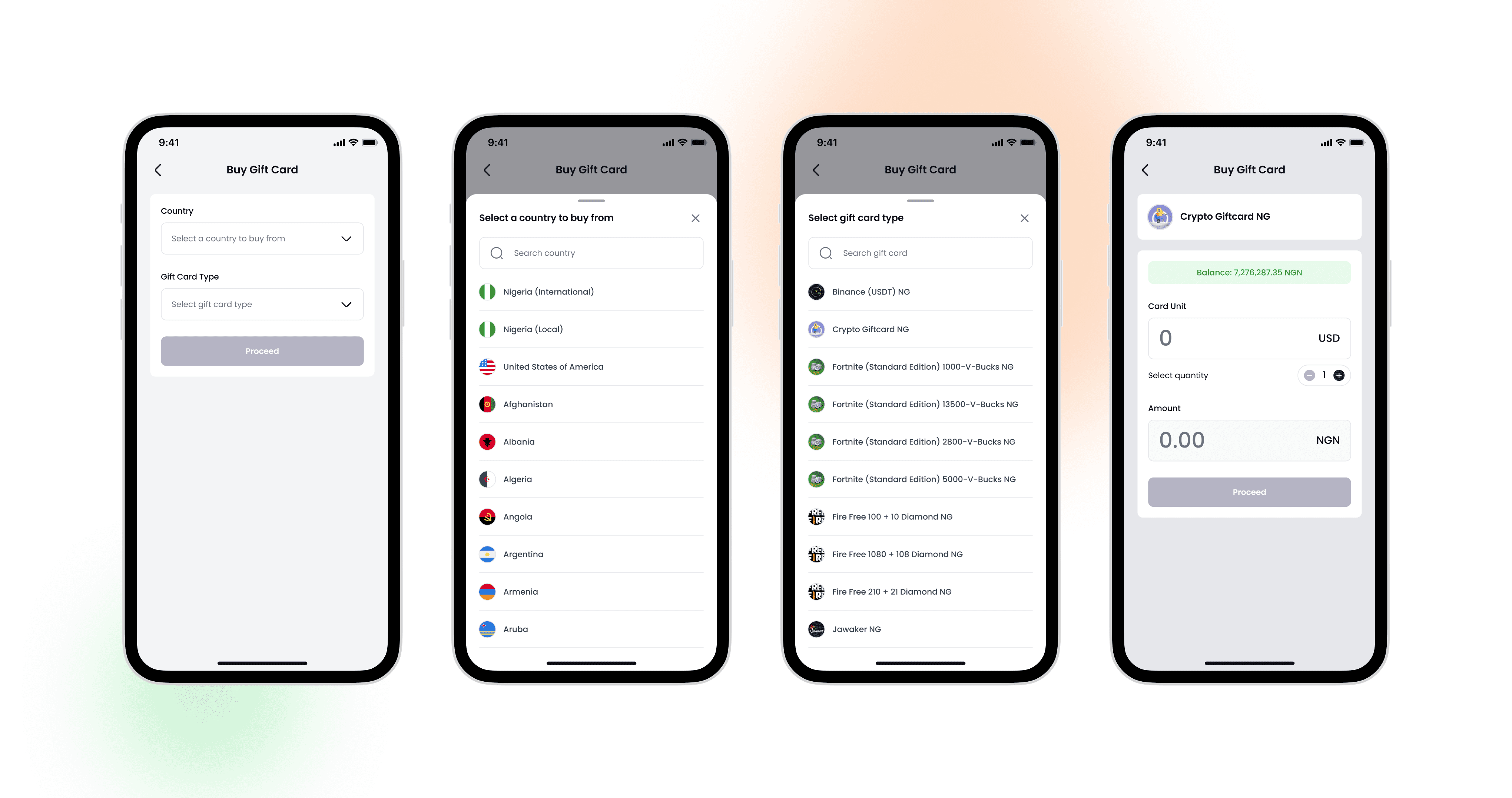 Clarity → Clear separation between crypto, fiat, and gift card flows.