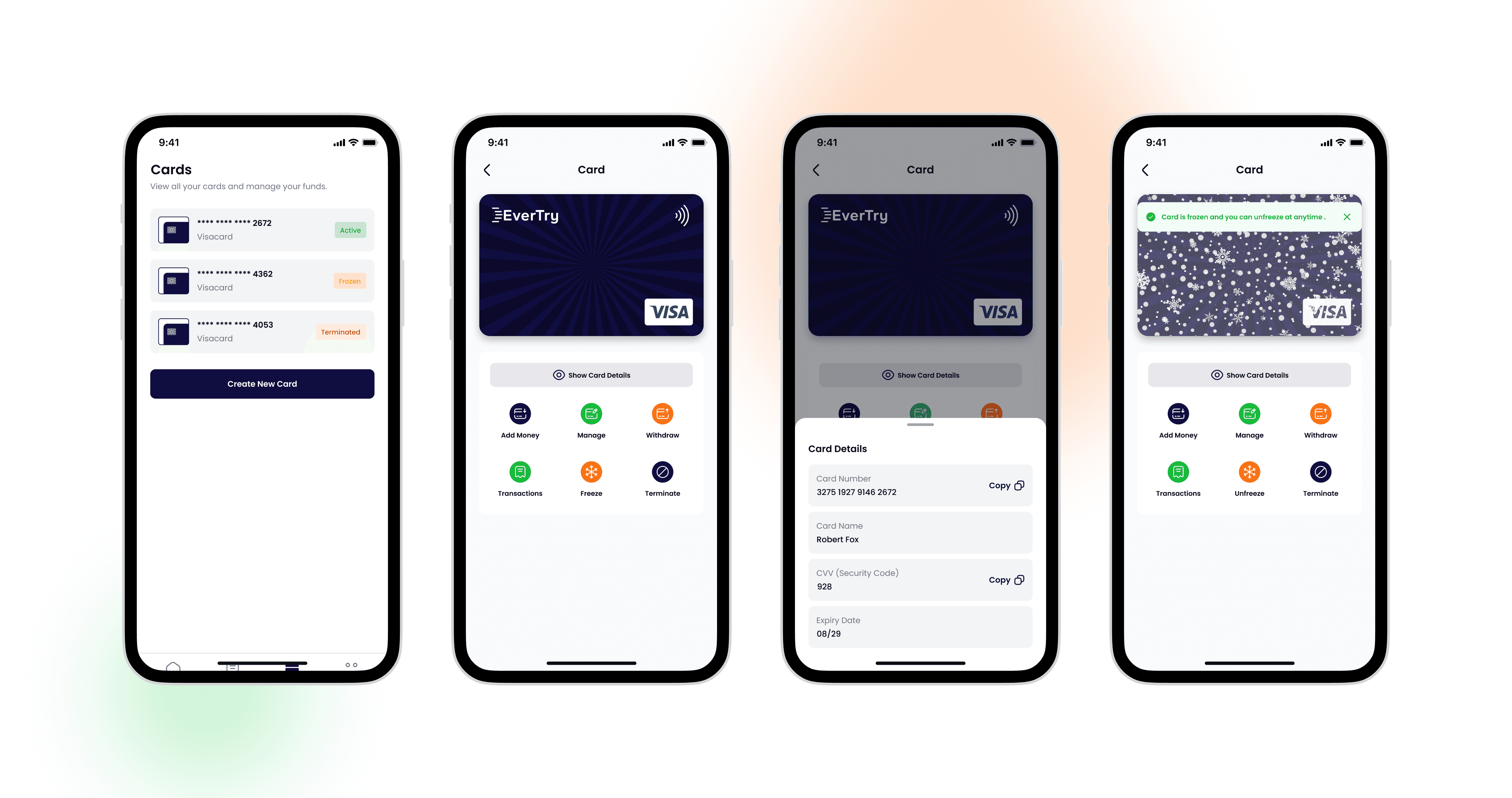 Users can generate new cards, freeze/unfreeze, and view transaction history.