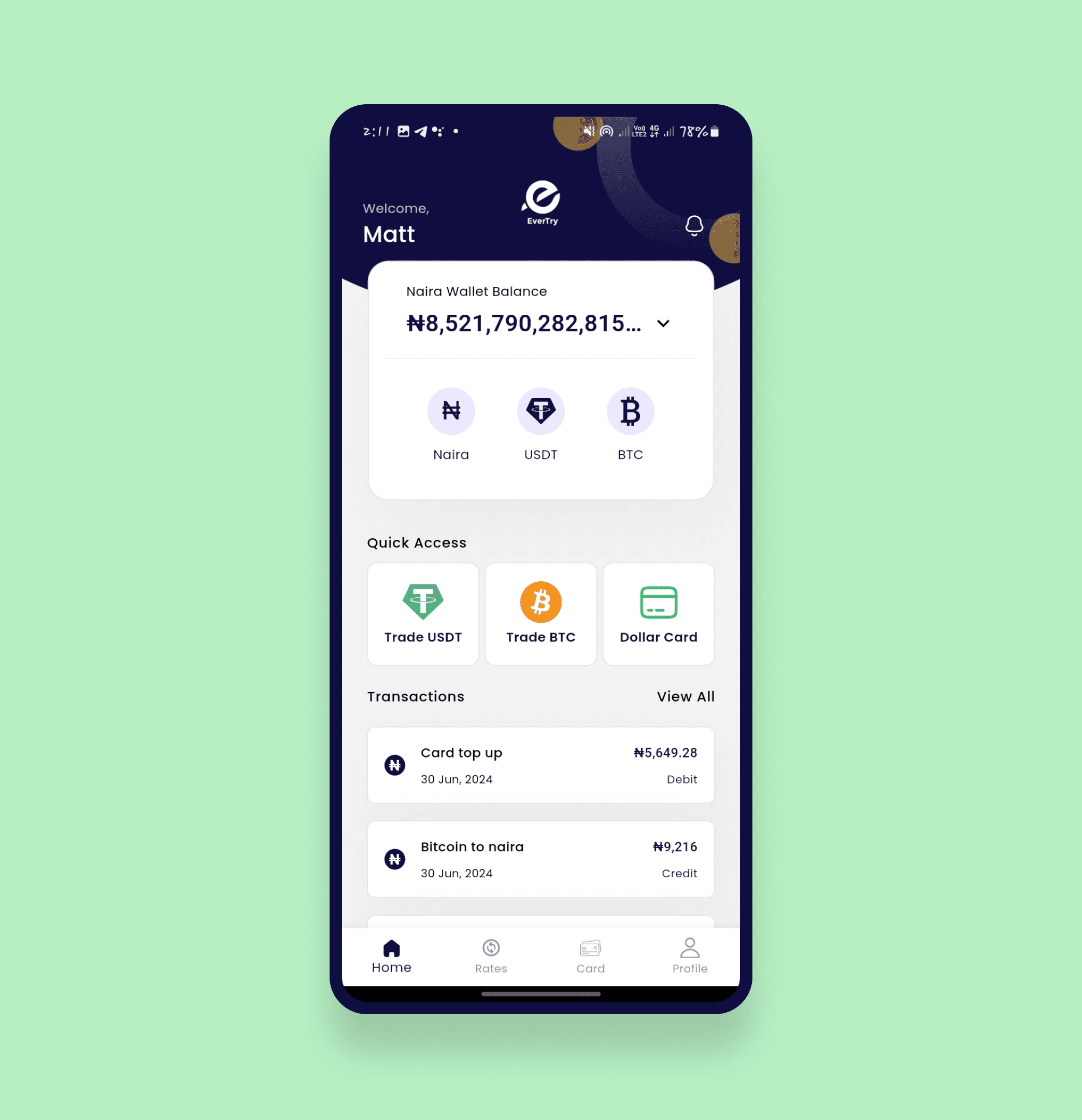 Evertry is a fintech platform that empowers users to generate virtual cards for online payments, buy and sell crypto, manage fiat wallets (Naira, USD), and purchase gift cards. I redesigned their existing mobile app to improve usability, create a modern and trustworthy visual identity, and deliver a smoother experience across devices.