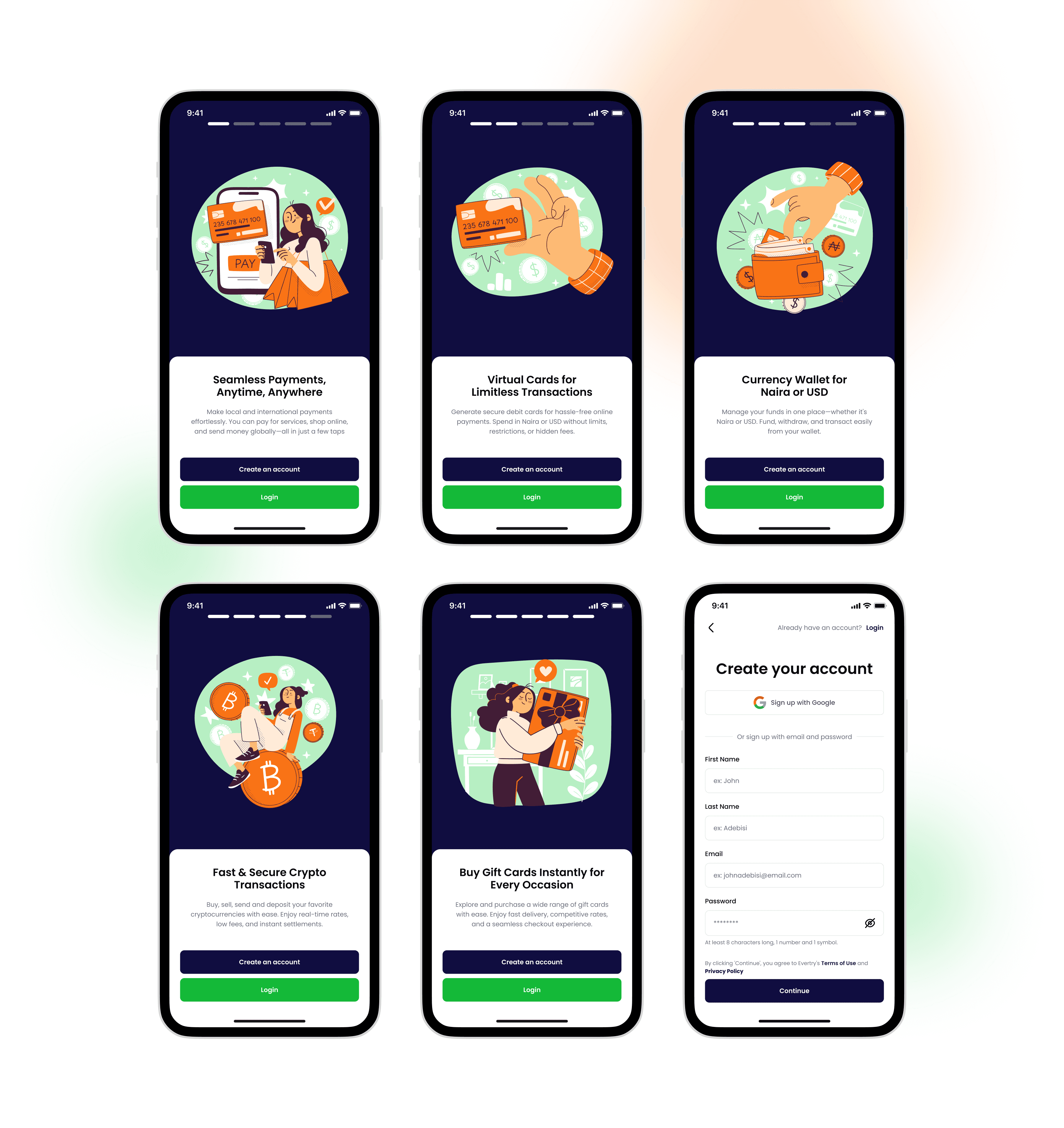 Explains the core features: virtual card, crypto wallet, Naira account, global USD/USDT transactions, and gift card purchases. Designed with bold illustrations and microcopy that speaks plainly.