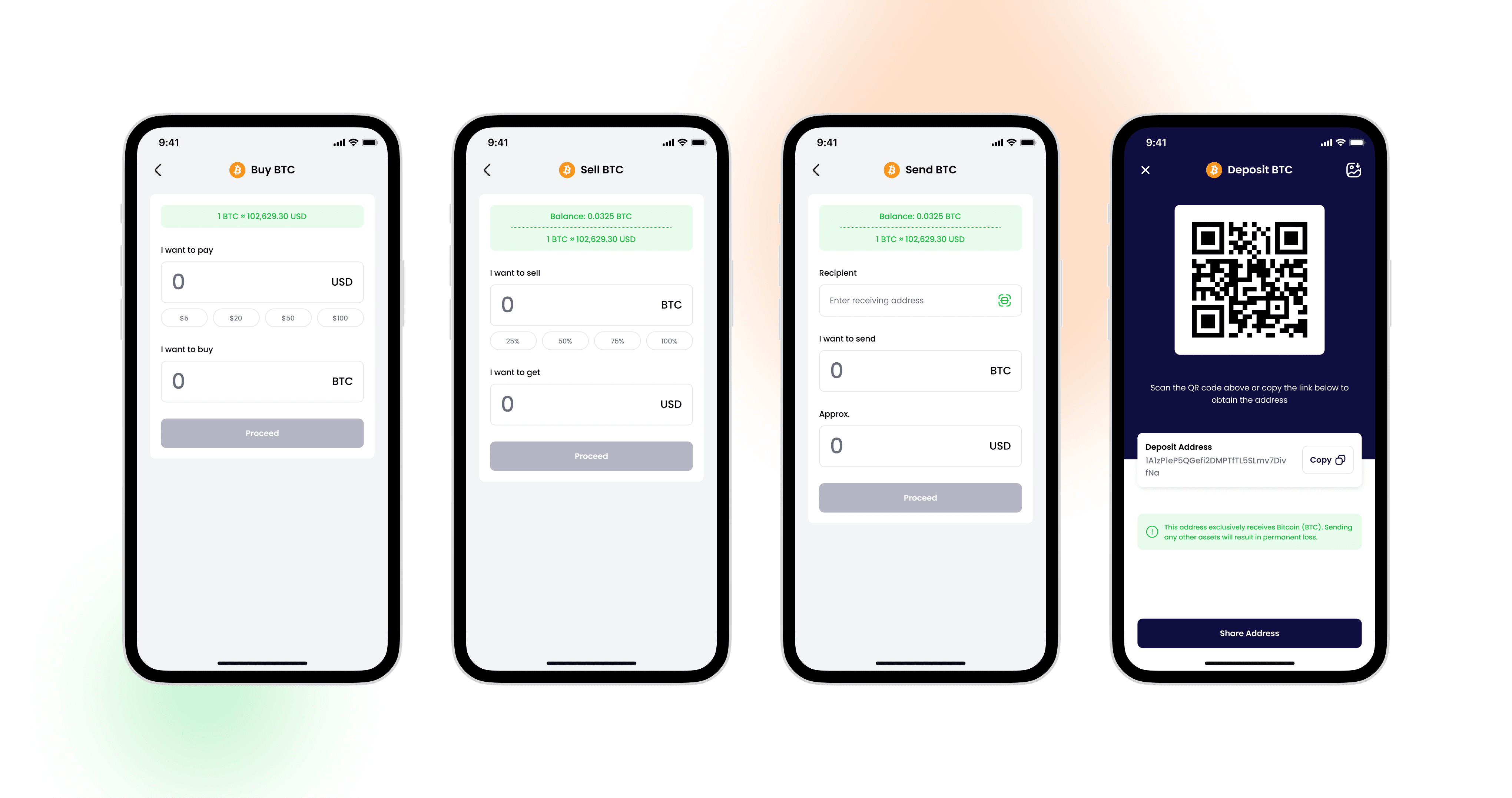 Buy, sell, send, and deposit cryptocurrency (BTC, USDT, etc.).